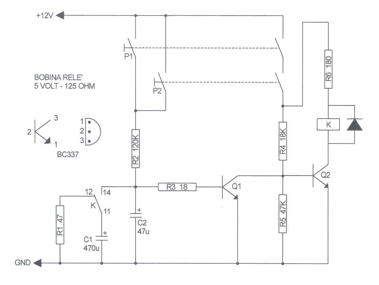 Se premuto per tempo il secondo pulsante eccita il relè, che tramite il contatto a scambio abilita il condensatore C1.